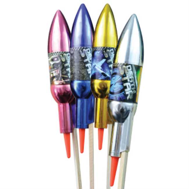 The daddy of rockets is here with four varieties. These include assorted peony bursts with crackling stars, green glittering willow bursts with popping flower effects, golden brocade burst with red glittering stars and red