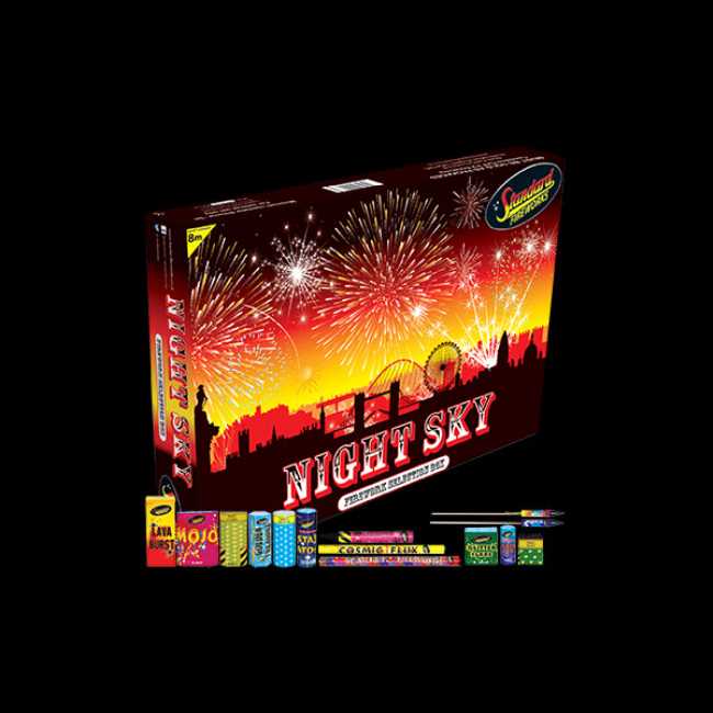 Night Sky is a based on our Sky Line selection box which we sold out of last year. Night Sky contains 15 larger fireworks, including 4 cakes, 2 mines and even 2 rockets, with an emphasis on more aerial effects.